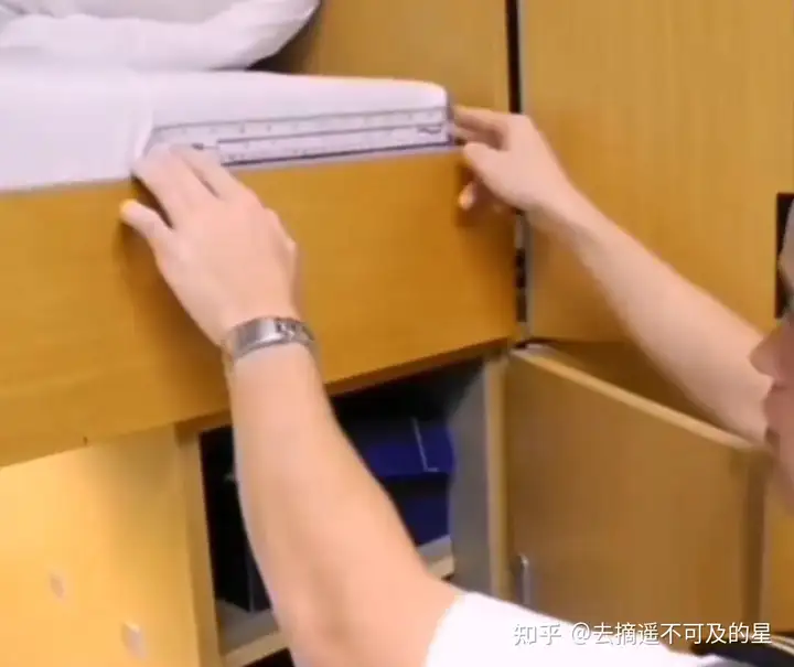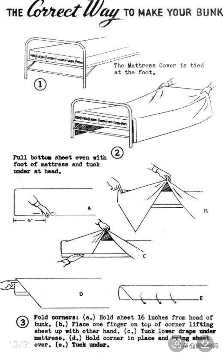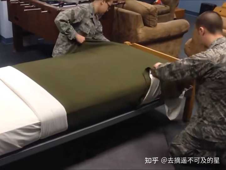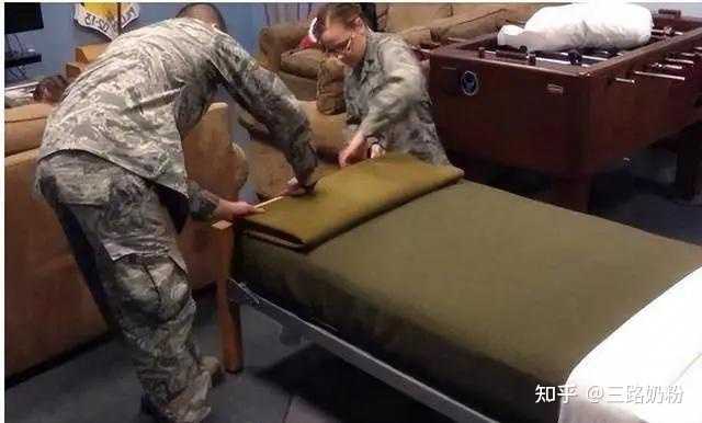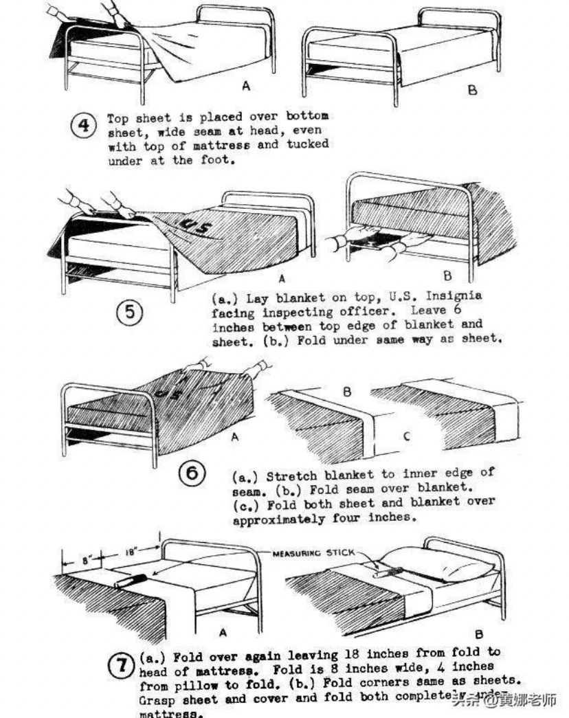 比如枕头的留白是多少、床单卷起来的距离是多少等都有十分详细的规条,连四个角都一定要是45度。美军这个铺床标准跟解放军叠豆腐块相比,不遑多让吧?