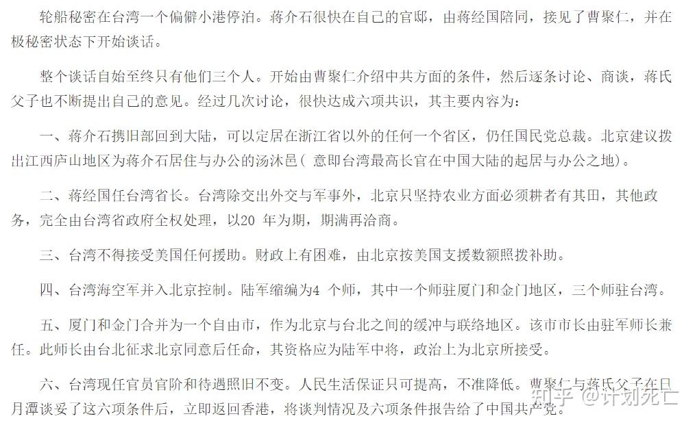 -------------------------------------------回答一下,认为是引蛇出洞的朋友。大可不必担心,蒋要是愿意回来,台湾大概率是高度自治状态,消化起来要很长时间,蒋介石肯定活不到大陆彻底控制台湾的时候。
